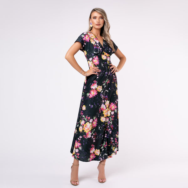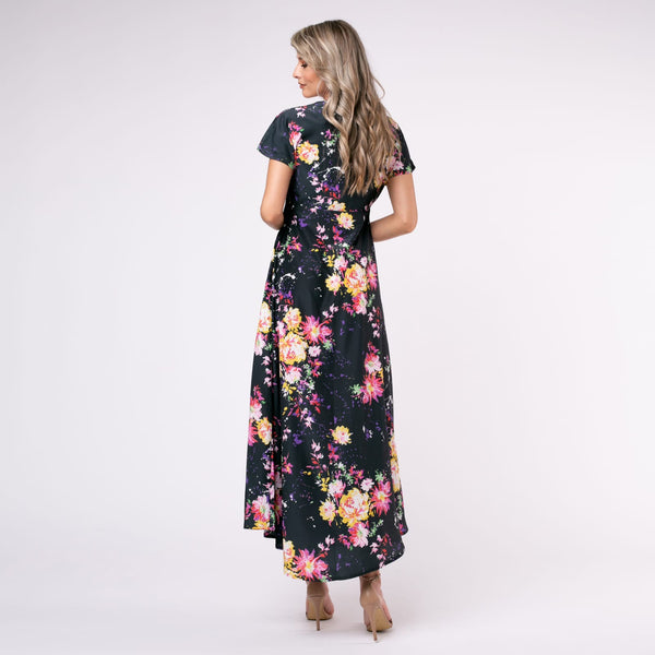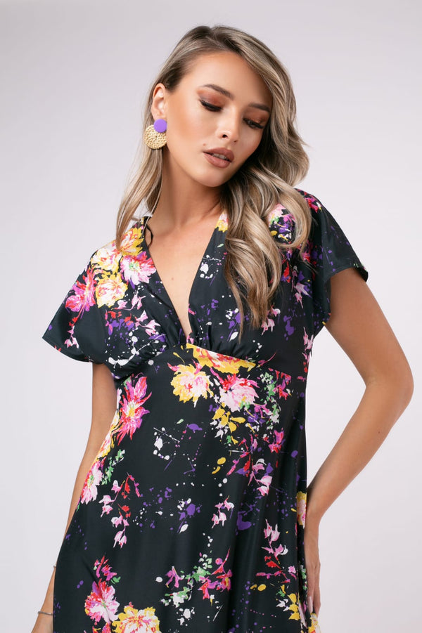 Adaugă un strop de romantism garderobei tale cu această rochie lungă neagră cu imprimeu floral vibrant. Confecționată din material ușor și fluid, rochia are o croială cambrată în talie, decolteu în V și mâneci scurte, oferind un look rafinat și feminin. Designul floral în nuanțe de roz, galben și alb transformă această piesă într-o alegere versatilă, potrivită atât pentru evenimente de zi, cât și pentru ocazii speciale de seară.
